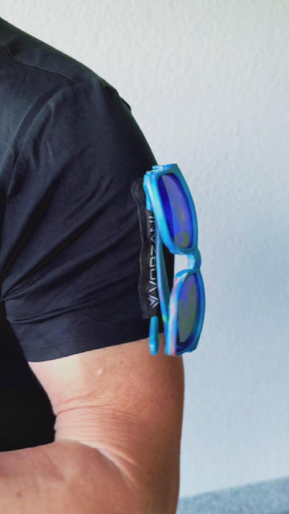 - Giá đỡ kính mắt tích hợp đang chờ cấp bằng sáng chế được đặt thuận tiện ở vai trái và được thiết kế để giữ kính râm hoặc kính thuốc một cách an toàn.